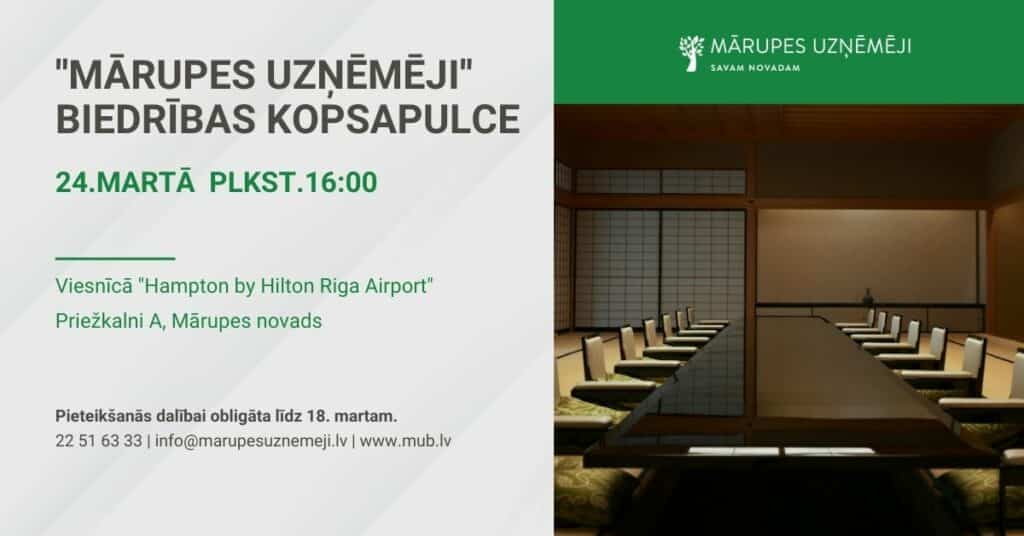 Aicinām Jūs piedalīties biedrības “Mārupes uzņēmēji” kopsapulcē, kas notiks24. martā plkst. 16:00 viesnīcas Hampton by Hilton Riga Airport semināra telpā (Priežkalni A, Mārupes novads). Tikšanās laikā atskatīsimies uz paveikto, apstiprināsim 2025. gada pārskatu, ievēlēsim jauno Biedrības valdi un pārrunāsim 2026. gada aktivitātes.